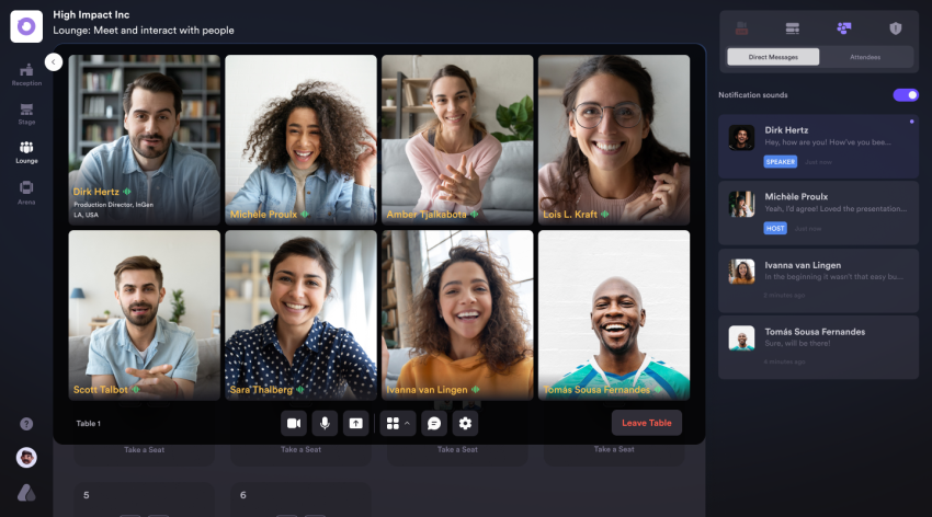 Members can screen share, text chat, and get face-to-face interaction time with other participants in same table.
